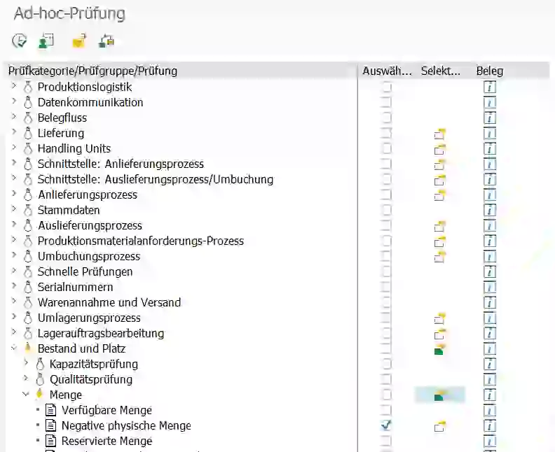 Sie haben Schiefstände im SAP EWM System? Diese treten vor allem bei Tests auf, wenn noch viel am Customizing gedreht wird oder eigene Programmierungen ziehen. EWM hat hierauf eine Antwort: Die Transaktion CHM_LOG. Etwas ungewohnt zu bedienen, können mit dieser verschiedenste Ad-Hoc Prüfungen durchgeführt werden und so etwa schiefe oder negative Bestände gefunden und danach auch direkt über die Transaktion aufgelöst werden. Aber auch darüber hinaus sind verschiedenste Auswertungen zu Lieferungen und Belegen möglich. In den folgenden Screenshots wurde eine Ad-Hoc Prüfung auf negative physische Menge durchgeführt und die gefundenen Einträge können dann auch direkt gelöscht bzw. reduziert werden.