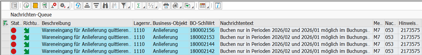 - „Buchen nur in Perioden 2026/02 und 2026/01 möglich im Buchungskreis 1100“ → Die Periode wurde nicht korrekt geöffnet und es kann nicht verbucht werden