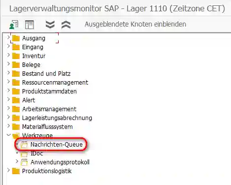 Aufzurufen sind die Queueeinträge neben den genannten Transaktionen, aber auch einfach über den Lagerverwaltungsmonitor. Hier findet sich über den Knoten „Werkzeuge“ direkt die „Nachrichten-Queue“: