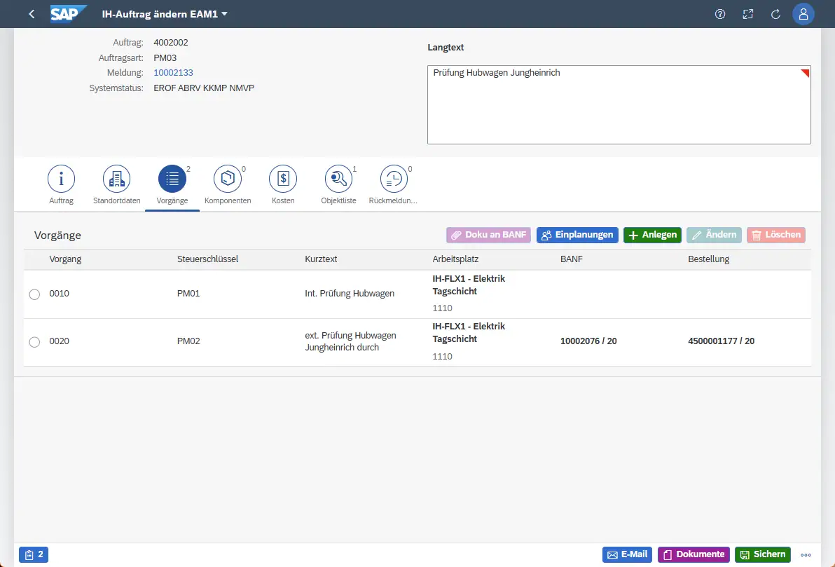 Öffnen wir den Auftrag im Einplanungscockpit, werden auch die Daten aus BANF und Bestellung für den externen Dienstleistungsvorgang angezeigt.