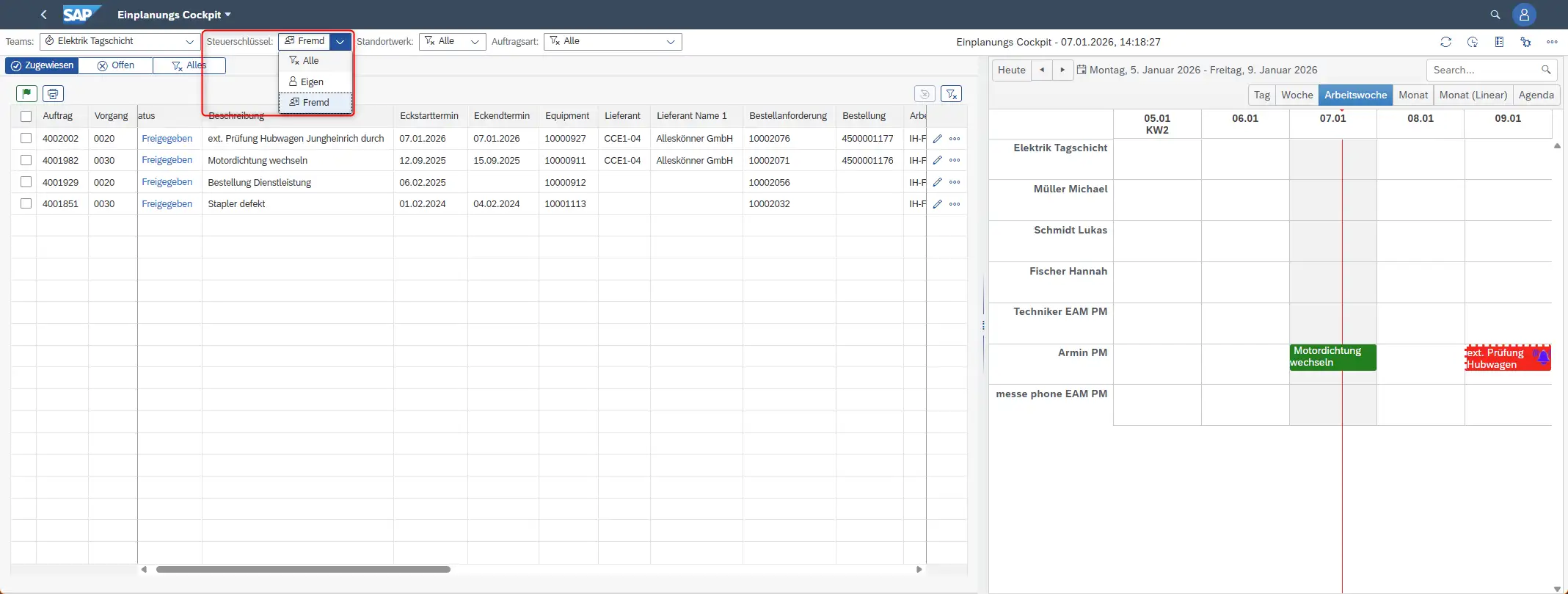 Die Bearbeitung unterscheidet sich kaum von internen Arbeitsplätzen – lediglich die Kostenstelle verweist auf die Fremdfirma. Externe Mitarbeiter können eingeplant werden und sogar Rückmeldungen selbst durchführen.