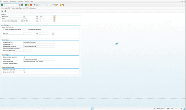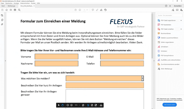 Employees can create a new notification using an Adobe interactive PDF form in SAP, which is created and designed according to your ideas in LifeCycle Designer. Within this form, the employees enter different data that are relevant for the SAP maintenance process. This includes, for example, contact details of the relevant person, information about the position of the machine in the factory and information about the problem. In addition, pictures can be uploaded in the form to make it easier to identify the problem.