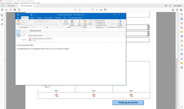 After the Interactive form by Adobe has been filled out, it is sent directly to the SAP system by email and a new maintenance notification is created. The recipient and subject are already predefined to make the process easier for the notifier and to avoid errors. If the notification is successfully created in SAP, the employee receives a confirmation with his notification number by e-mail. An integrated error management also ensures that possible errors in the system are reported to the responsible team, who can then manually revise the notification accordingly.