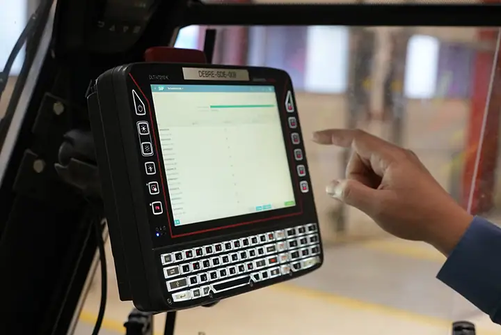 In Bremen, around 30 forklift terminals and hand scanners were equipped with FlexMobile apps. In addition, several desktop devices were installed so that goods movements can still be recorded in the event of a Wi-Fi failure. Here’s how the process works: With the FlexMobile app “Feedback on Process Order,” handling units from production are digitally recorded and automatically posted or reported back to SAP as available (bagged) goods. At the end of this process, the product label is printed, which makes the container uniquely identifiable from then on.
